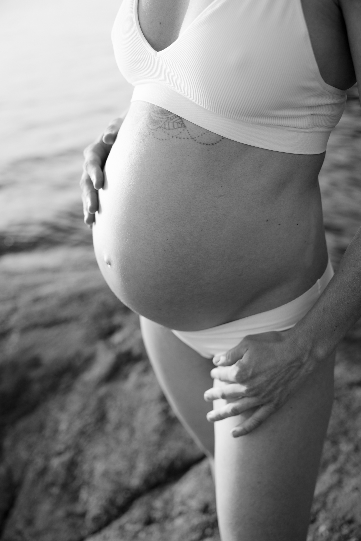 Svartvit närbild på gravidmage i vattnet.