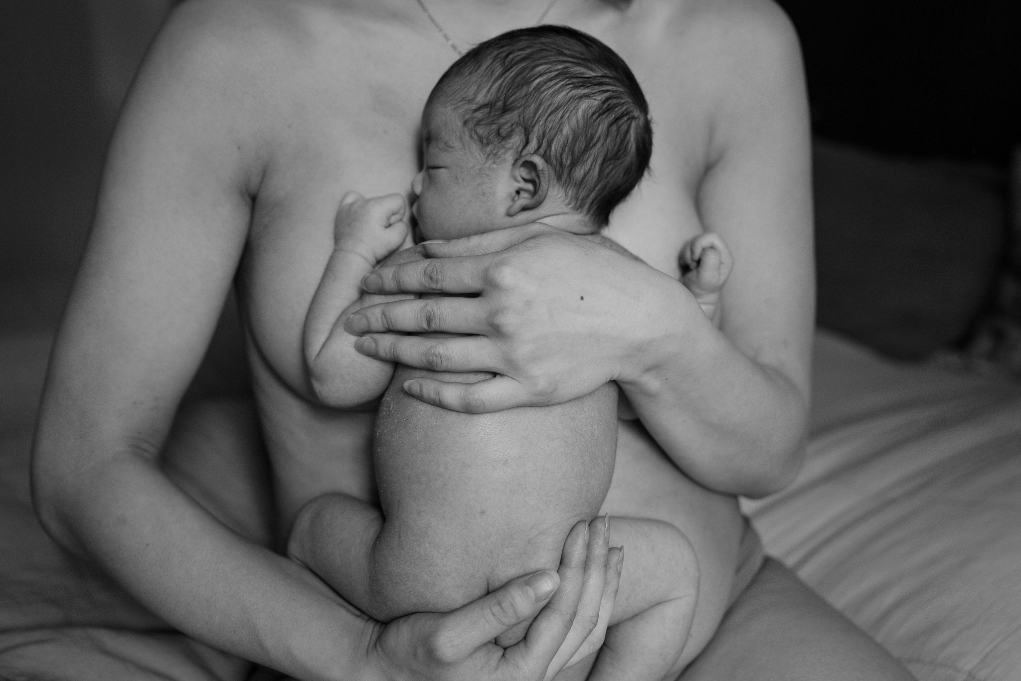 En nyfödd bebis ligger i mammas famn. Mamma pussar bebisen på huvudet.